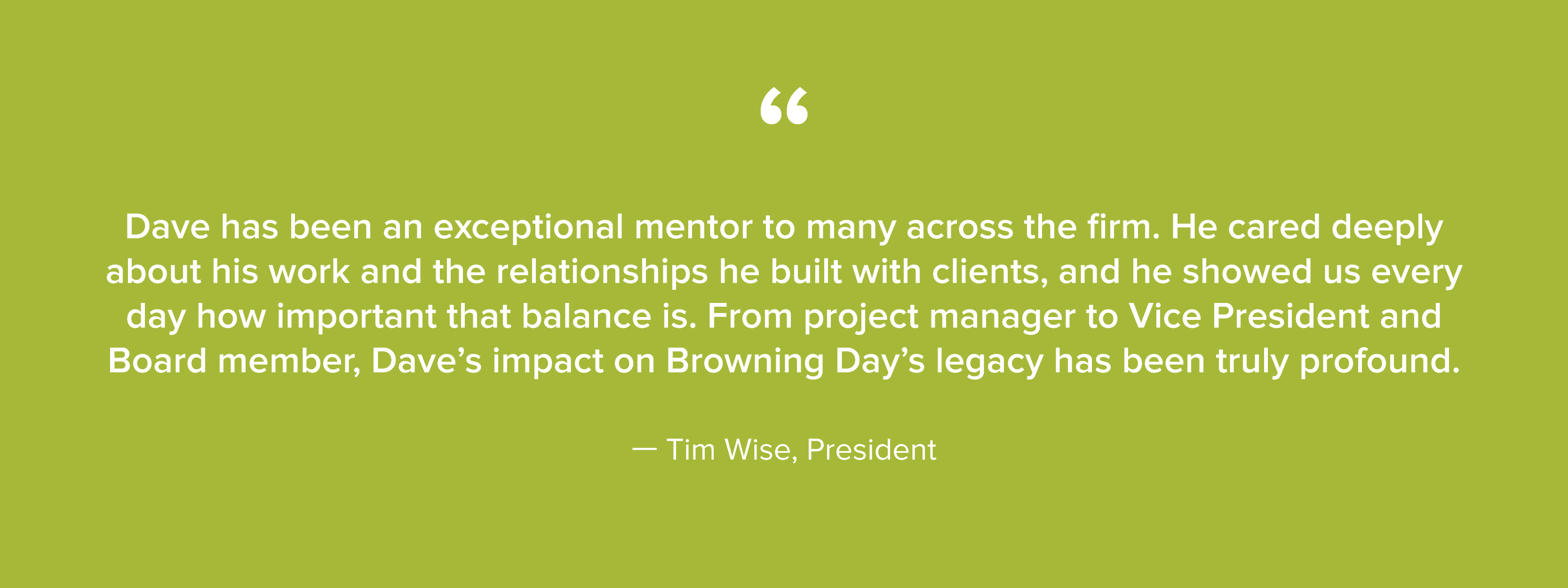 Throughout his career, Dave helped establish the systems, habits, and shared values that remain part of Browning Day’s foundation. His influence lives on in how we collaborate, how we problem-solve, and how we successfully hold ourselves accountable to high standards.